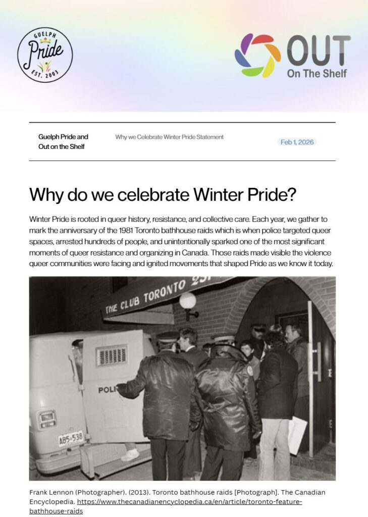 In 2018, Winter Pride was revived. Winter Pride is a collaboration between a number of LGBTQQIP2SAA community organizations and University of Guelph organizations and clubs to provide the University of Guelph students, faculty, and the community a week to celebrate Pride throughout the school year. This year there were only two individuals from Guelph Pride involved with Winter Pride, and with the loss of the original Chair, one remaining member on both committees. This individual stepped in as interim Chair for Winter Pride, and the organizing team decided to move from a committee to a non-hierarchical collective governing style and was made up of members from multiple campus and community organizations, as well as individuals from the wider community. There were 19 events in total over the course of 10 days: Queer Community Fair, Pride Denied Movie Screening, QTPOC Murder Mystery, Queer Magic, Profs Meet’n’Greet, Queer Zine Workshop, Safer Sex Workshop, Fierce!, Discussion on Substance Use, Queer Trivia, Queer Slow Dance, Out on the Shelf Open House, Polyamory Workshop, Kissing Games Workshop, Queer Knit & Craft, QTPOC Play with Clay, Queer Skate, Mental Health Workshop, and an Operation Soap Tribute.